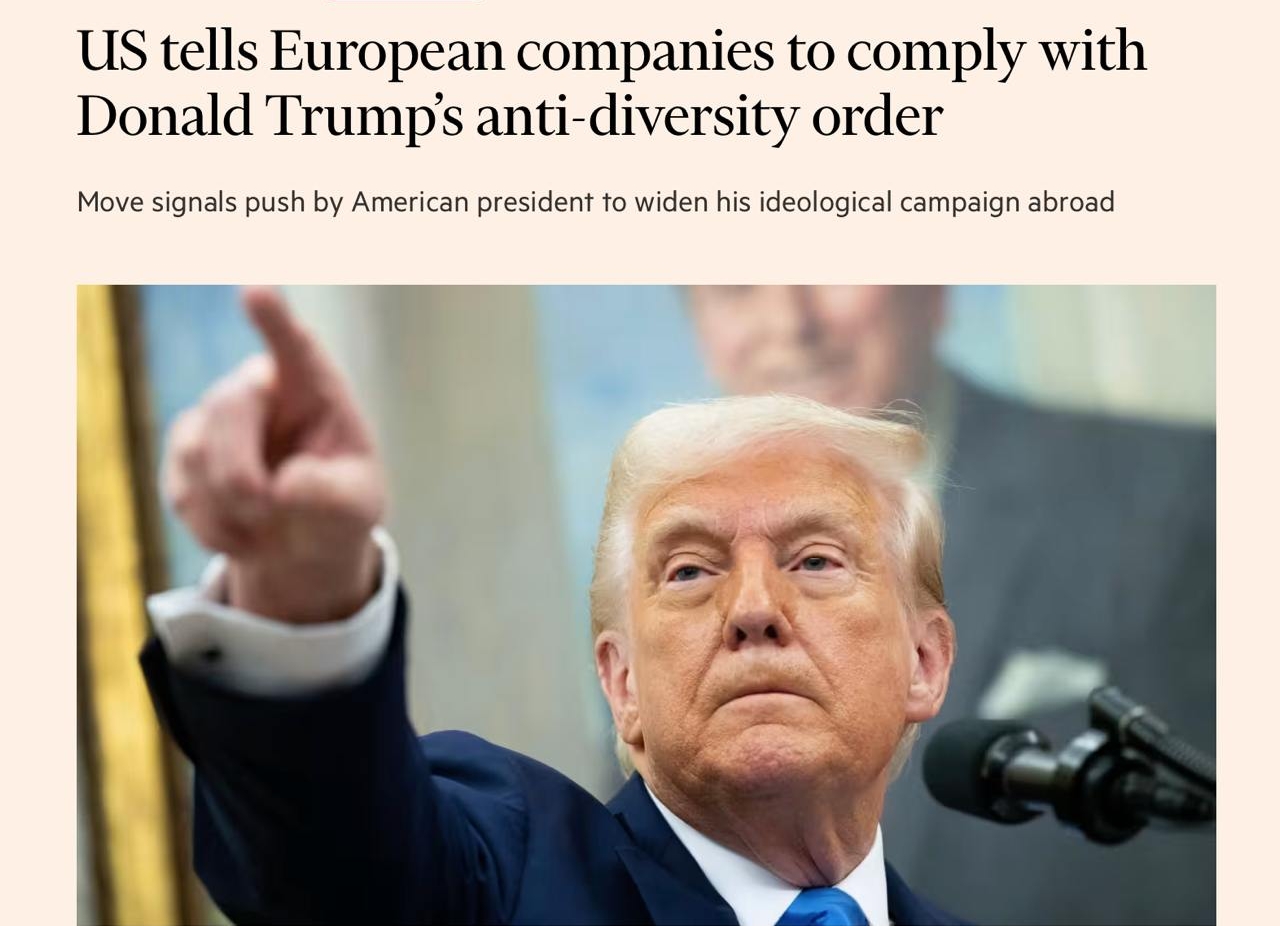 Так, Білий дім направив листи кільком великим європейським компаніям з вимогою дотримуватися указу президента США Дональда Трампа, який забороняє ініціативи в галузі гендерного різноманіття, рівності та інклюзивності. Заборона поширюється на іноземні фірми, якщо є постачальниками чи підрядниками американського уряду.