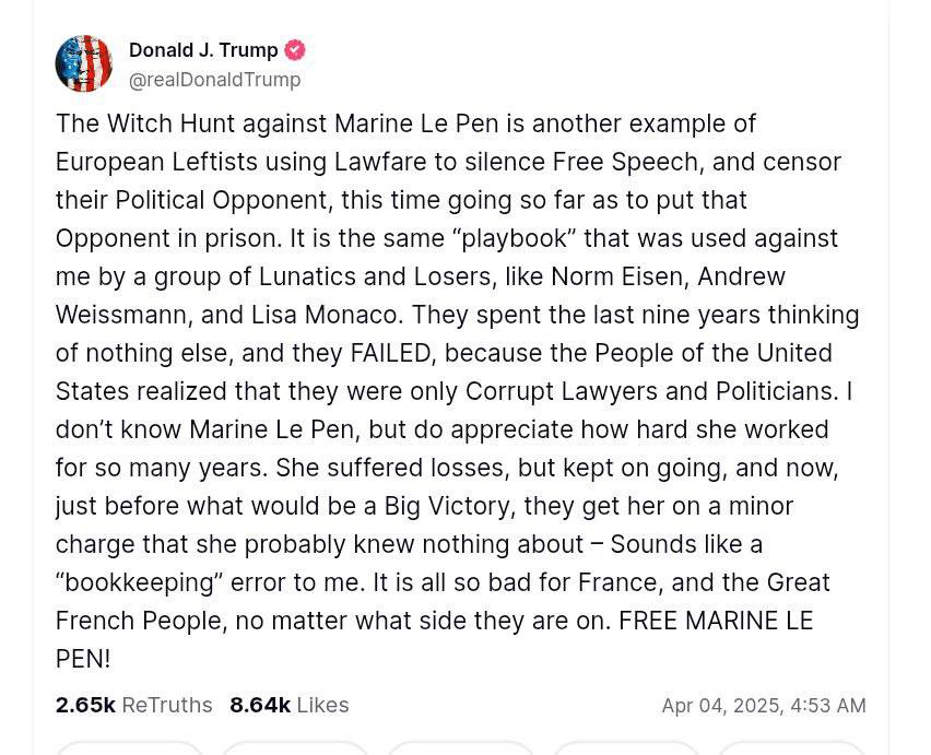 "Полювання на відьом проти Марін Ле Пен - ще один приклад того, як європейські ліві використовують правові механізми, щоб змусити замовкнути свободу слова і цензурувати своїх політичних опонентів, цього разу заходячи так далеко, що готові посадити опонента до в'язниці. Це та сама "методичка", яку застосували проти мене група безумців та невдах", - написав Трамп.
