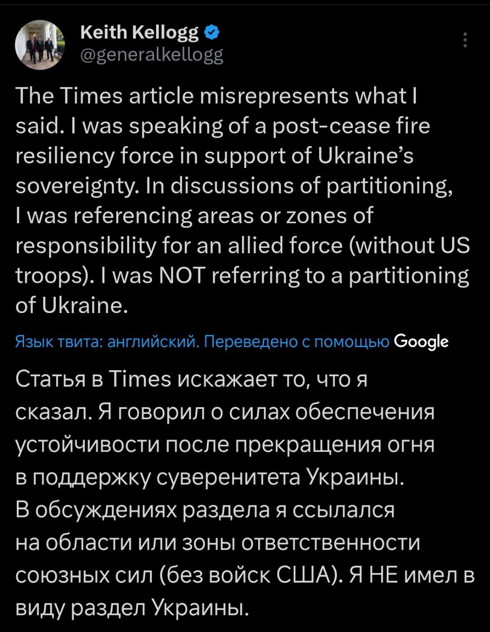 "Стаття в The Times спотворює те, що я сказав. Я говорив про сили стійкості після припинення вогню на підтримку суверенітету України. В обговореннях поділу я мав на увазі райони або зони відповідальності для союзних сил (без участі військ США). Я НЕ мав на увазі поділ України", - написав Келлог.