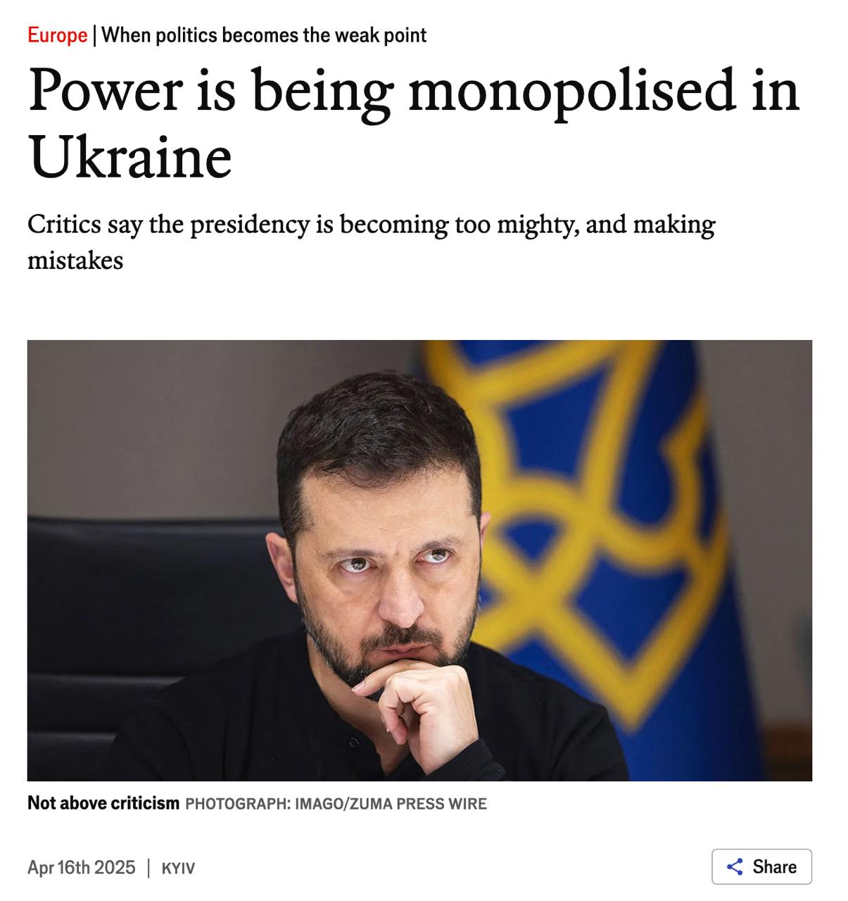 "Деякі з найзатятіших прихильників України все більше турбуються, що концентрація влади може зайти занадто далеко. Адміністрація президента не бажає ділитися владою не тільки з опонентами, але і з будь-ким, кого вважають потенційним суперником. Ризик полягає в тому, що це підриває стійкість країни, що самоорганізується", - пише The Economist.