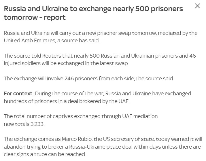 За даними джерела видання, за посередництва ОАЕ завтра кожна сторона передасть по 246 полонених, включаючи 46 поранених.