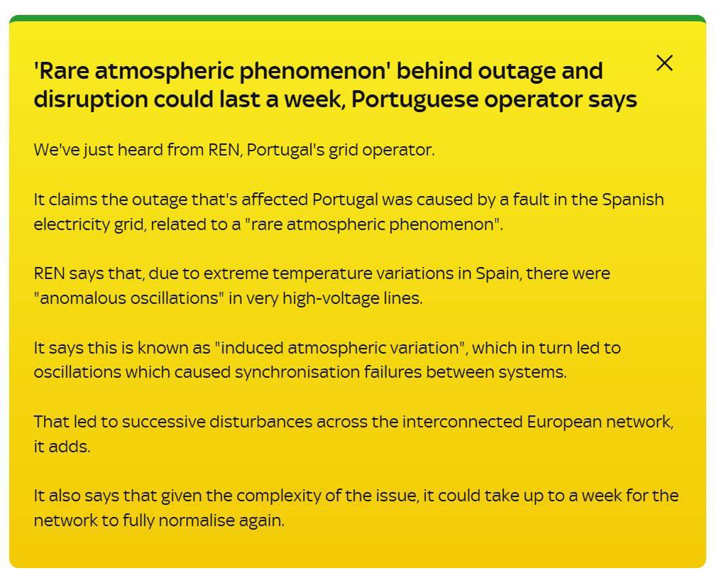 Причиною масштабного блекауту в Іспанії, Португалії та кількох інших країнах Західної Європи могло стати рідкісне атмосферне явище і перебої зі світлом триватимуть ще тиждень.