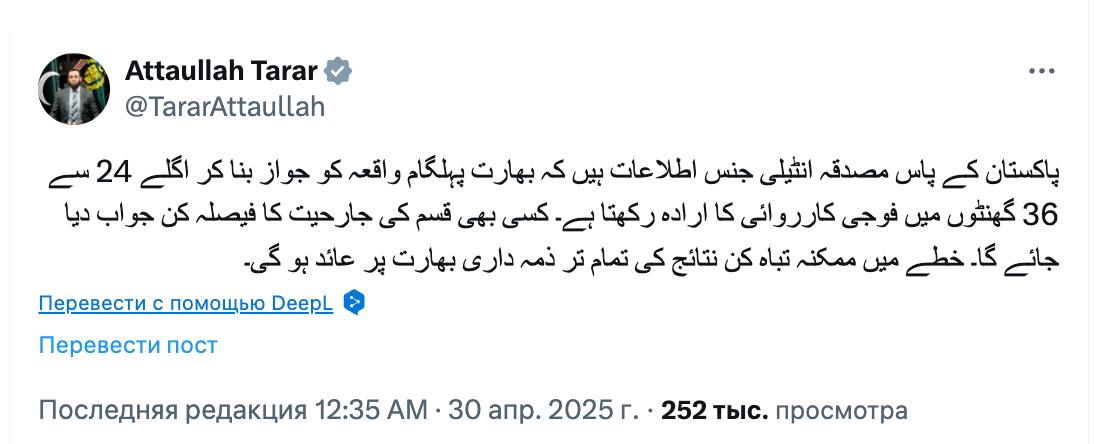 "Індія, використавши інцидент у Пулвамі як привід, планує провести військову операцію протягом наступних 24–36 годин. Пакистан залишає за собою право на будь-який вид дій у відповідь. Вся відповідальність за можливі руйнівні наслідки повністю лягає на Індію", - написав Тарар.