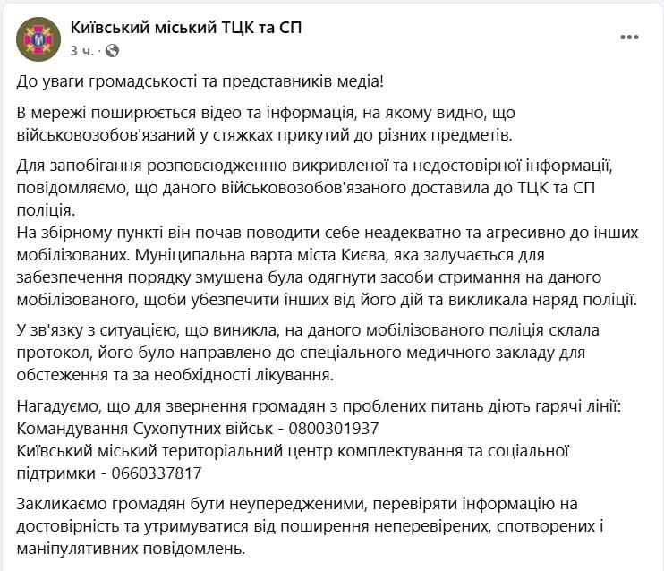У публікації сказано, що цього чоловіка доставила до ТЦК поліція, а на збірному пункті він почав поводитися неадекватно та агресивно стосовно інших мобілізованих. За інформацією міського ТЦК, муніципальна варта була "змушена вдягнути кошти стримування на цього мобілізованого".