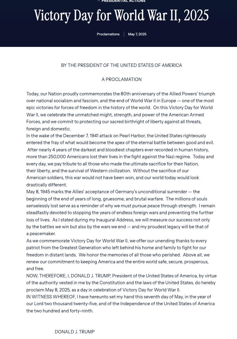 Президент США Дональд Трамп сьогодні проголосив 8 травня днем перемоги у Другій світовій війні. Він назвав це "80-ми роковинами перемоги союзних держав над націонал-соціалізмом і фашизмом".