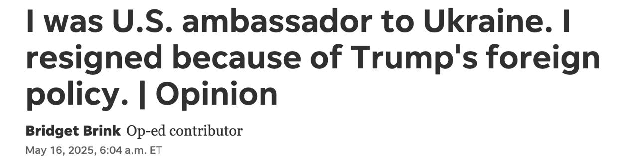 Колишній посол США в Україні Бріджіт Брінк заявила, що пішла у відставку через свою незгоду з політикою американського президента Дональда Трампа щодо України.