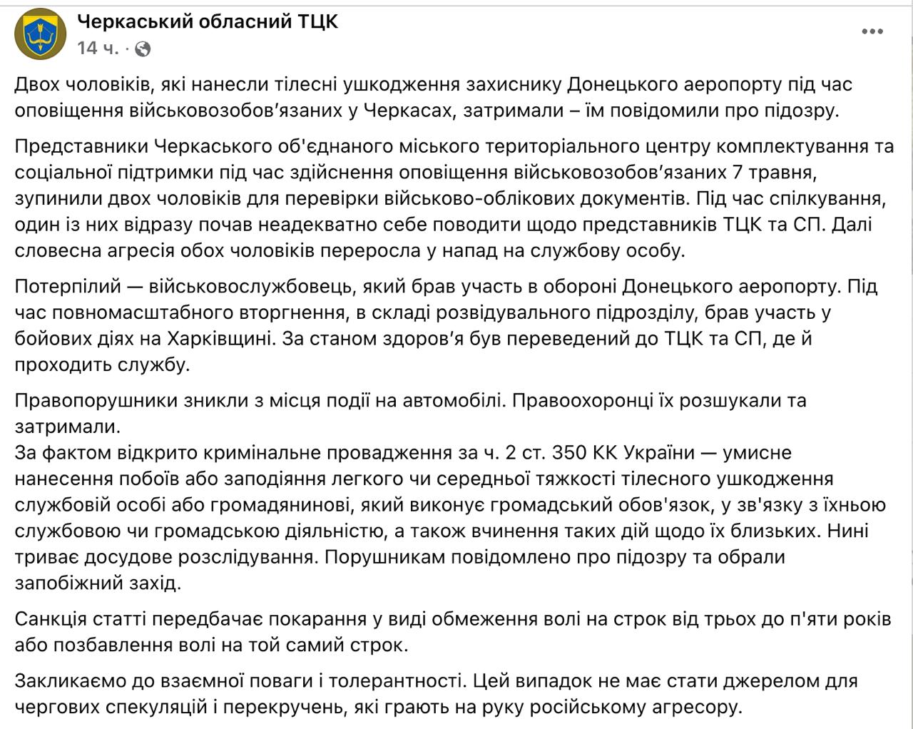 У Черкасах напали на працівника ТЦК Фото: із відкритих джерел
