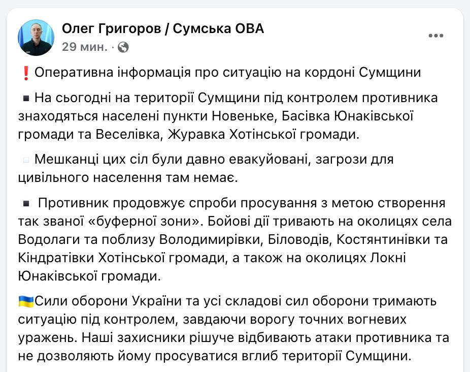 Губернатор Сумської області визнав, що російські війська контролюють чотири селища у прикордонні