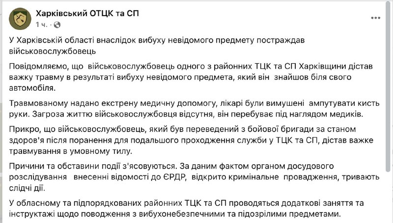 "Повідомляємо, що військовослужбовець одного з районних ТЦК та СП Харківщини отримав тяжку травму внаслідок вибуху невідомого предмета, який він знайшов біля свого автомобіля. Травмованому надано екстрену медичну допомогу, лікарі були змушені ампутувати кисть руки", - сказано у публікації.
