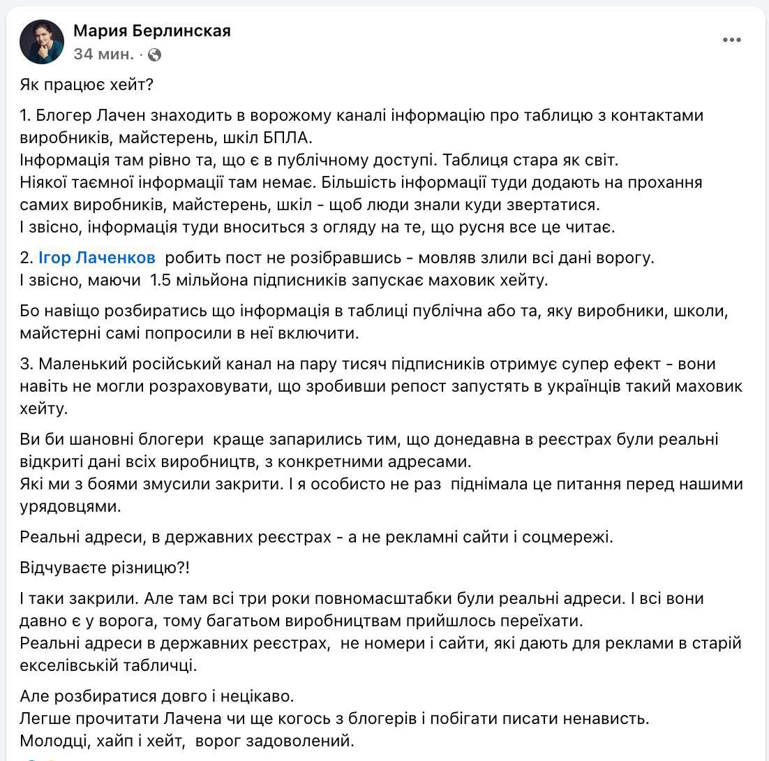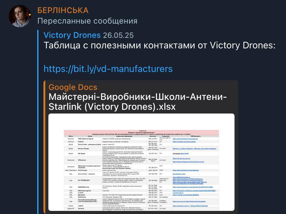 Проект Victory Drones, що курується нею, 25 травня опублікував таблицю з телефонами і веб-сторінками виробників дронів по всіх містах України. Сьогодні сама Берлінська зробила репост цієї таблиці у своєму телеграм-каналі.