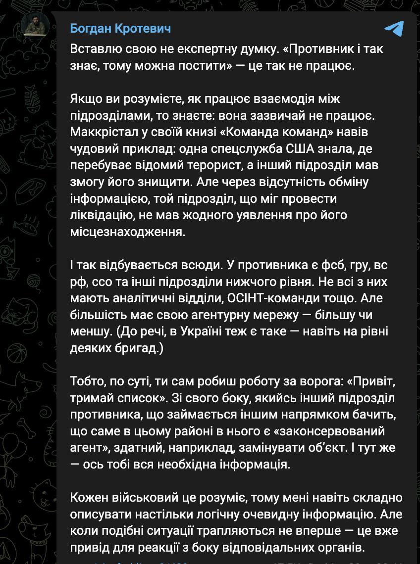 Колишній начальник штабу "Азова" Богдан Кротевич заявив, що волонтерка "зробила роботу за ворога". На його думку, ні українські, ні російські спецслужби не мають повного масиву інформації, що навіть перебуває у відкритому доступі. І якщо її "підсвітити", то противник може її використати.