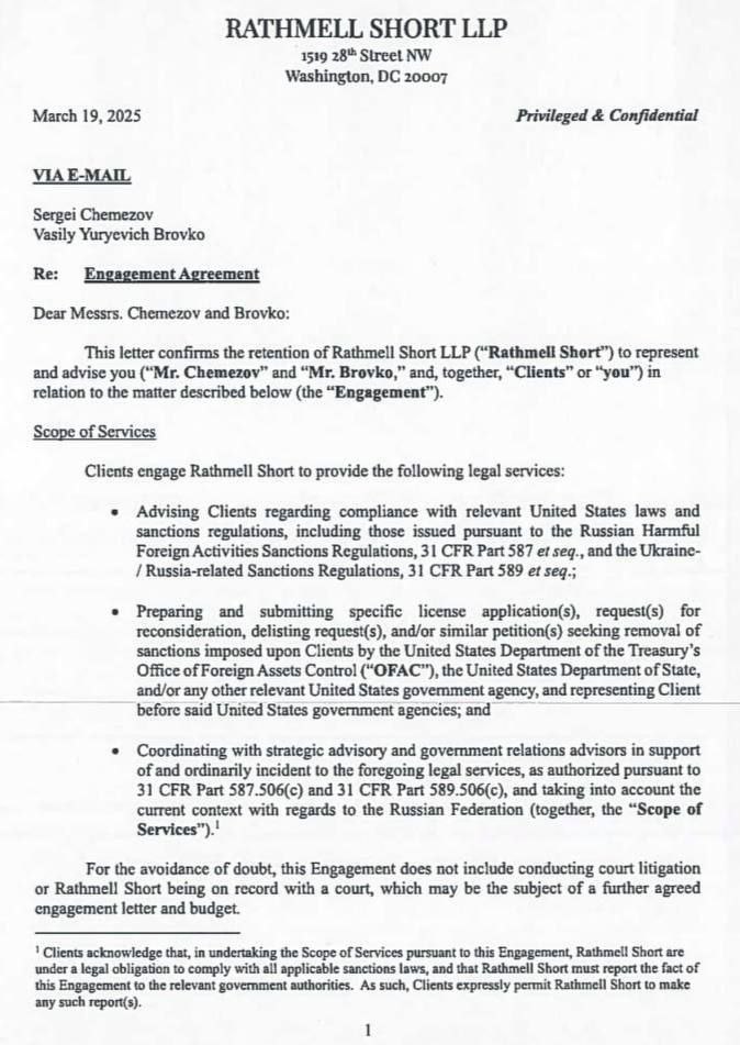 В опублікованому документі американського Мін'юсту написано, що Чемезов найняв американську юридичну фірму для ведення справ, пов'язаних зі спробою зняття чи пом'якшення санкцій США, а також для взаємодії з американською владою.