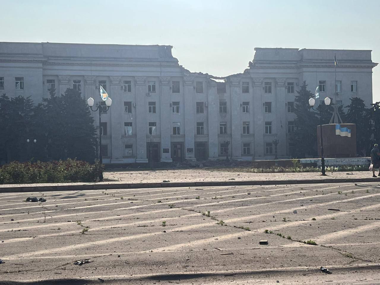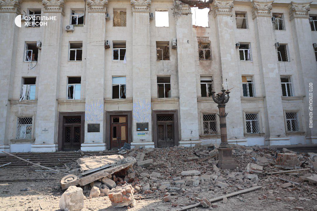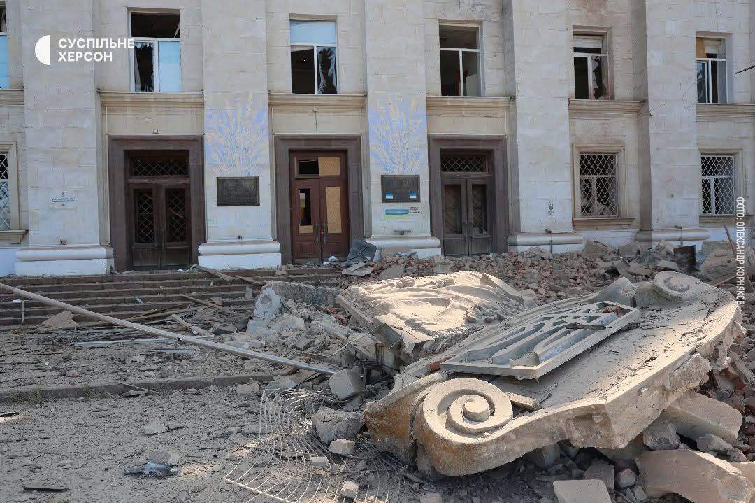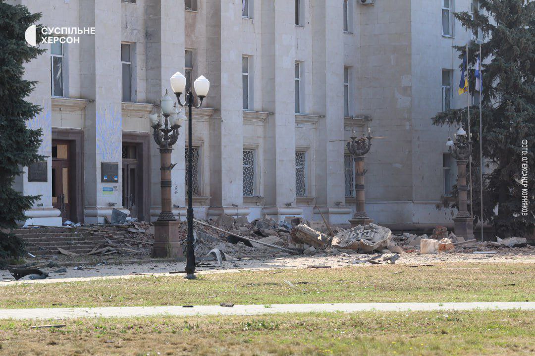 14:23 Після авіаудару на Херсонщині з фасаду будівлі обрушився герб України. Але через падіння він не розколовся.