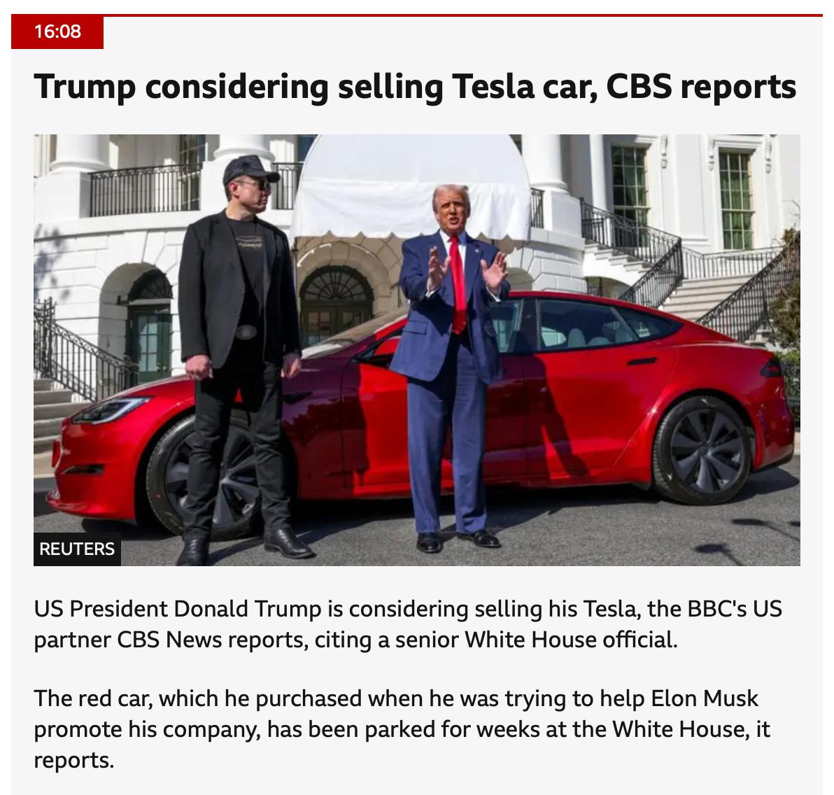 Тим часом Трамп задумався про продаж своєї червоної Tesla, яку купив на початку року, щоб допомогти Маску під час падіння акцій його кампанії через зближення з ним, повідомляє CBS із посиланням на джерело у Білому домі. Всі ці місяці автомобіль просто стояв на парковці біля адміністрації.