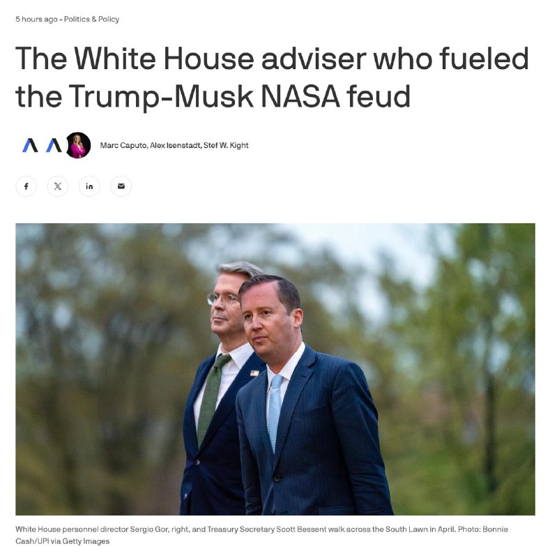 Гор є одним із найвпливовіших радників Трампа у Білому домі та співзасновником видавництва на паях із сином президента. Його напружені стосунки з Маском стали очевидними у березні, під час суперечки на засіданні кабінету міністрів, на якому Маск посварився з держсекретарем Марко Рубіо.