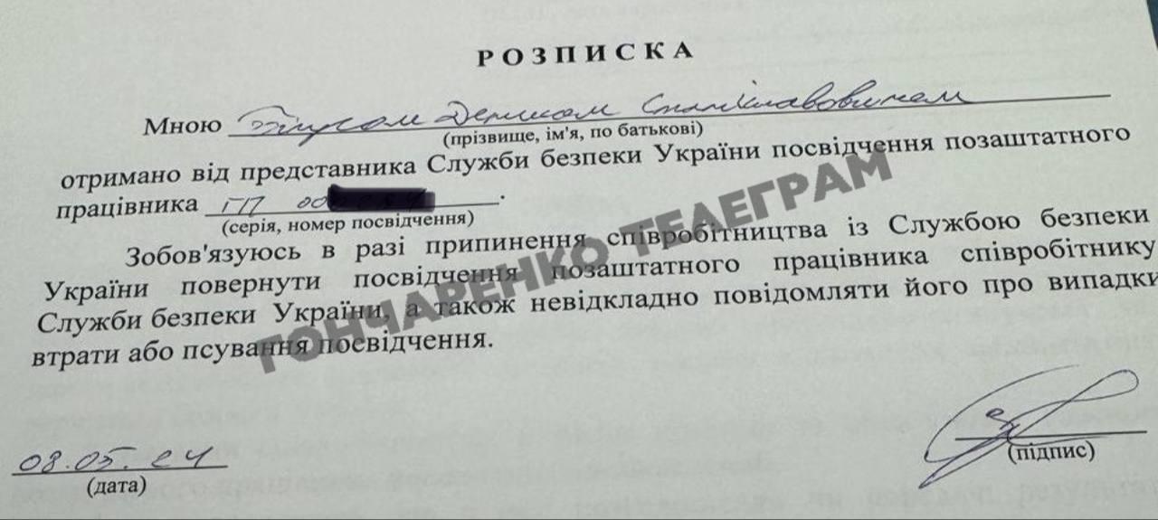 Про це заявив у своєму телеграм-каналі народний депутат Олексій Гончаренко. На підтвердження він опублікував згоду Бігуса на співпрацю та розписку про отримання посвідчення позаштатного працівника силового відомства.