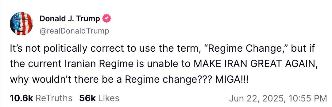 "Політкоректно не використовувати вираз "зміна режиму", але якщо нинішній іранський режим не здатний зробити Іран великим знову, чому б тоді не змінити режим?" - написав він, завершивши пост абревіатурою MIGA (Make Iran Great Again).