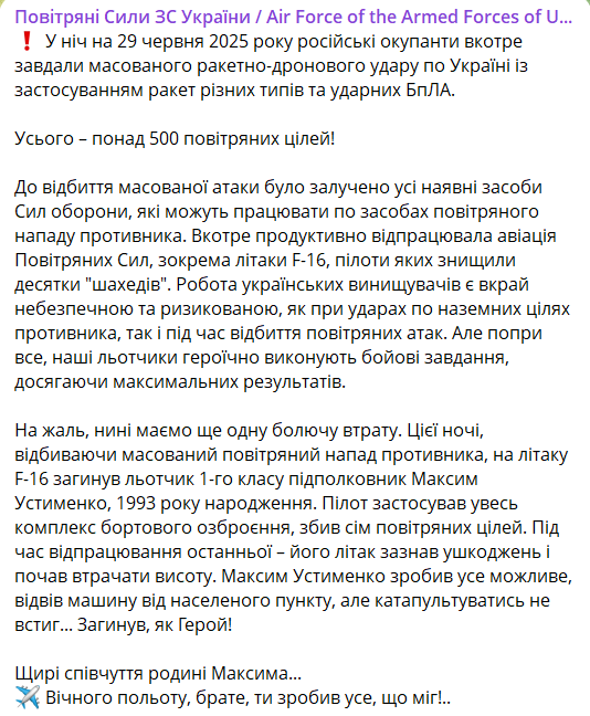 Сьогодні вночі, відбиваючи масовану повітряну атаку РФ, літаком F-16 загинув льотчик 1-го класу підполковник Максим Устименко, 1993 року народження.