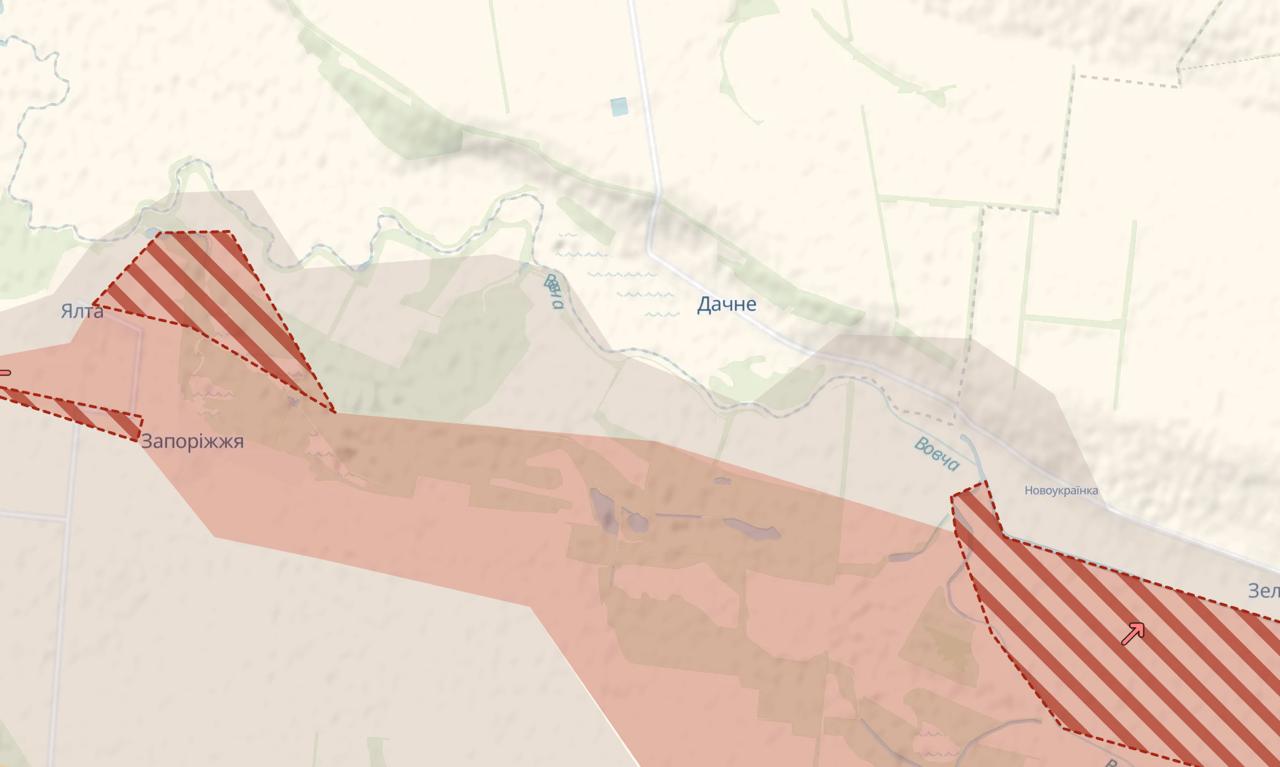На карті зазначено, що армія РФ просунулась одразу на шести ділянках на півдні Донецької області біля кордону з Дніпропетровською – від Шевченко (про захоплення якого ще кілька днів тому заявила РФ) до Ялти.