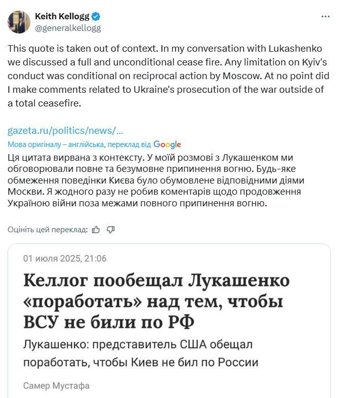 "Цю цитату вирвано з контексту. У моїй розмові з Лукашенком ми обговорили повне і безумовне припинення вогню. Будь-яке обмеження поведінки Києва було зумовлене взаємними діями Москви. Я ні в один момент не робив коментарів, пов'язаних з продовженням Україною війни поза повним припиненням вогню".