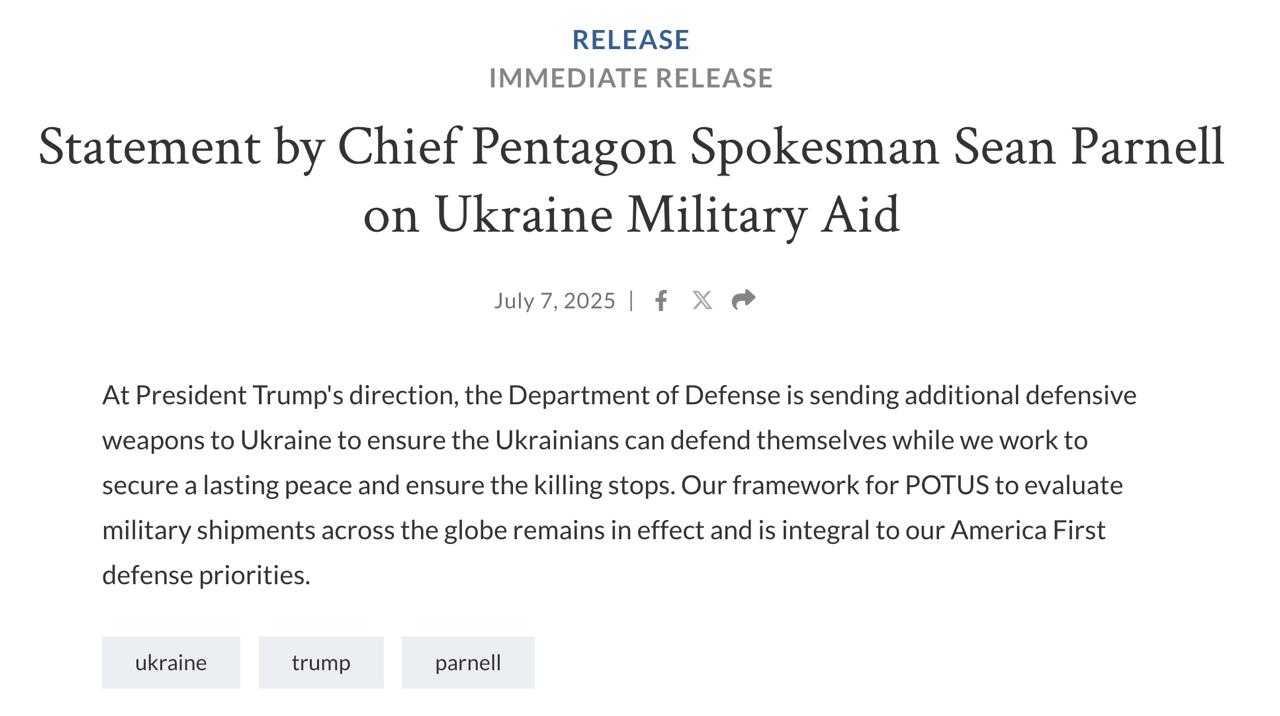 "За вказівкою президента Трампа Міністерство оборони направляє в Україну додаткове оборонне озброєння, щоб українці могли захищати себе, поки ми працюємо над забезпеченням міцного миру і припиненням насильства. Наша система оцінки поставок озброєнь по всьому світу для президента залишається в силі і є невід'ємною частиною нашої оборонної стратегії", - сказав Америка.