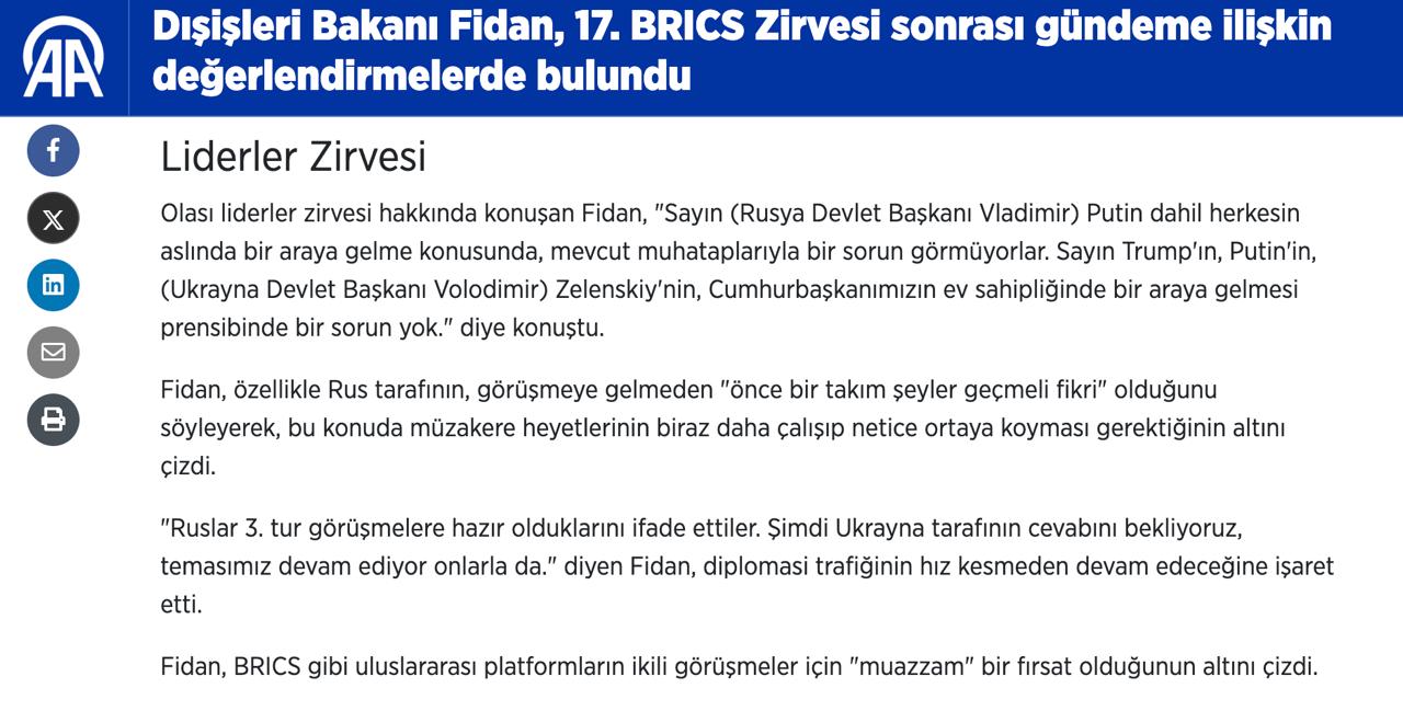 Про це заявив глава МЗС Туреччини Хакан Фідан після розмови з російським міністром Сергієм Лавровим, повідомляє агентство Anadolu.