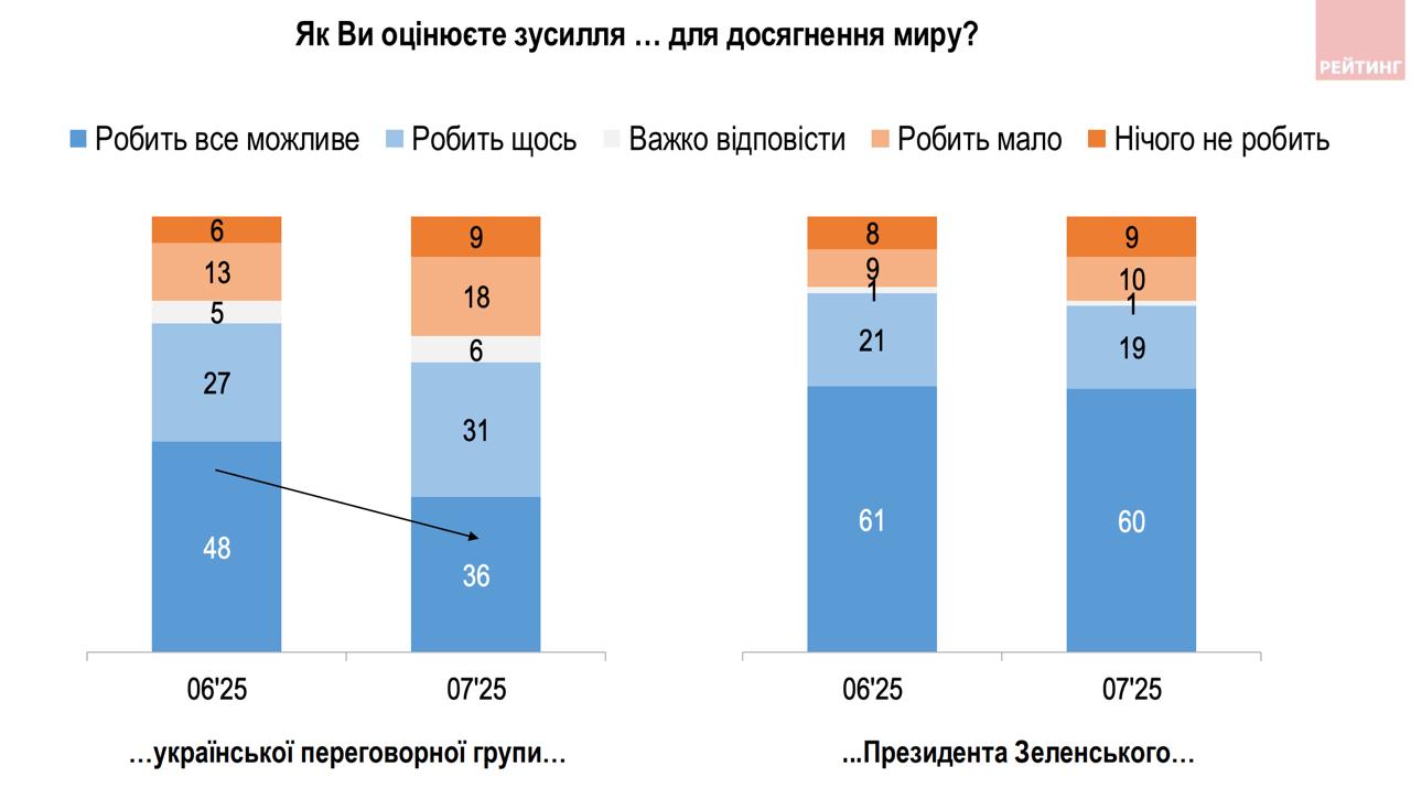 За минулий місяць поменшало на 12% громадян, які вважають, що українська переговорна група робить все можливе для досягнення миру.