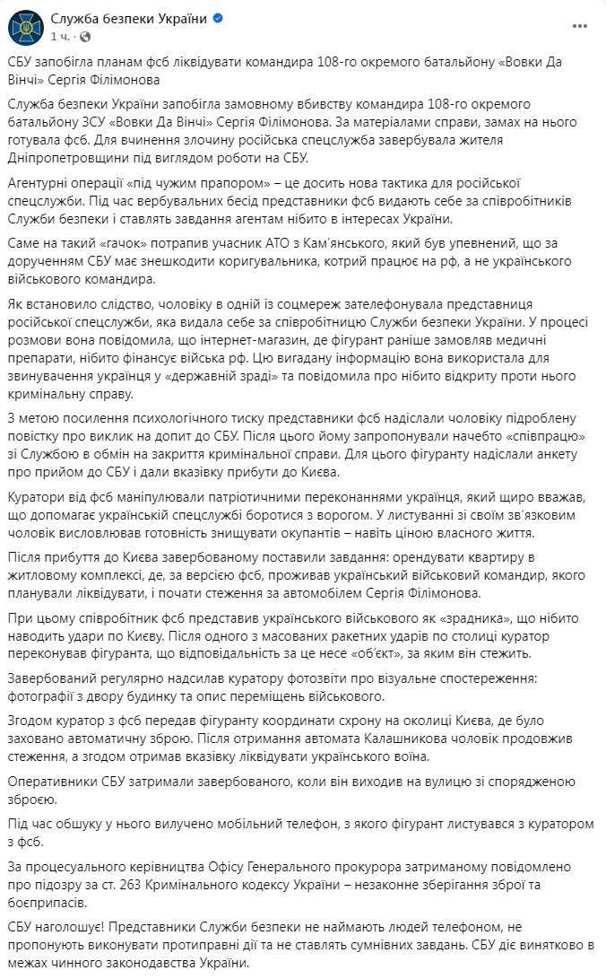 Служба безпеки України заявила про запобігання замовному вбивству командира батальйону "Вовки да Вінчі" Сергія Філімонова. За підготовкою замаху стоїть ФСБ, яка видавала себе за СБУ, стверджують у відомстві.