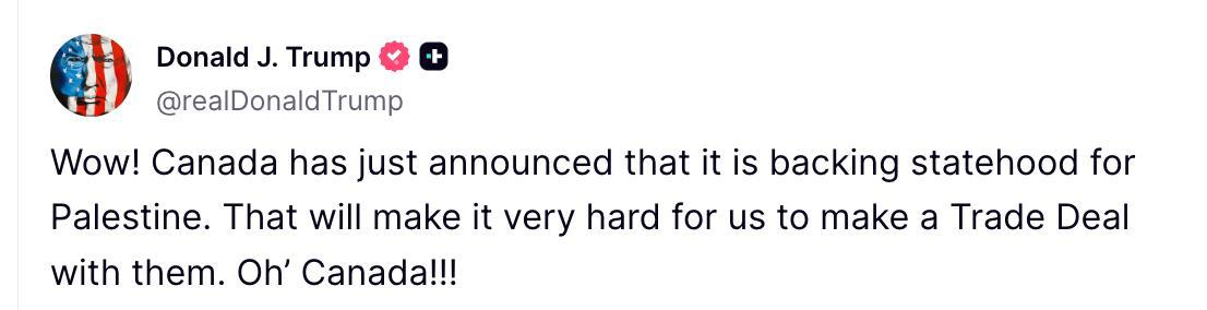 "Канада щойно оголосила, що підтримує державність Палестини. Це дуже ускладнить нам укладання торгової угоди з ними. О, Канадо!" – написав Трамп.