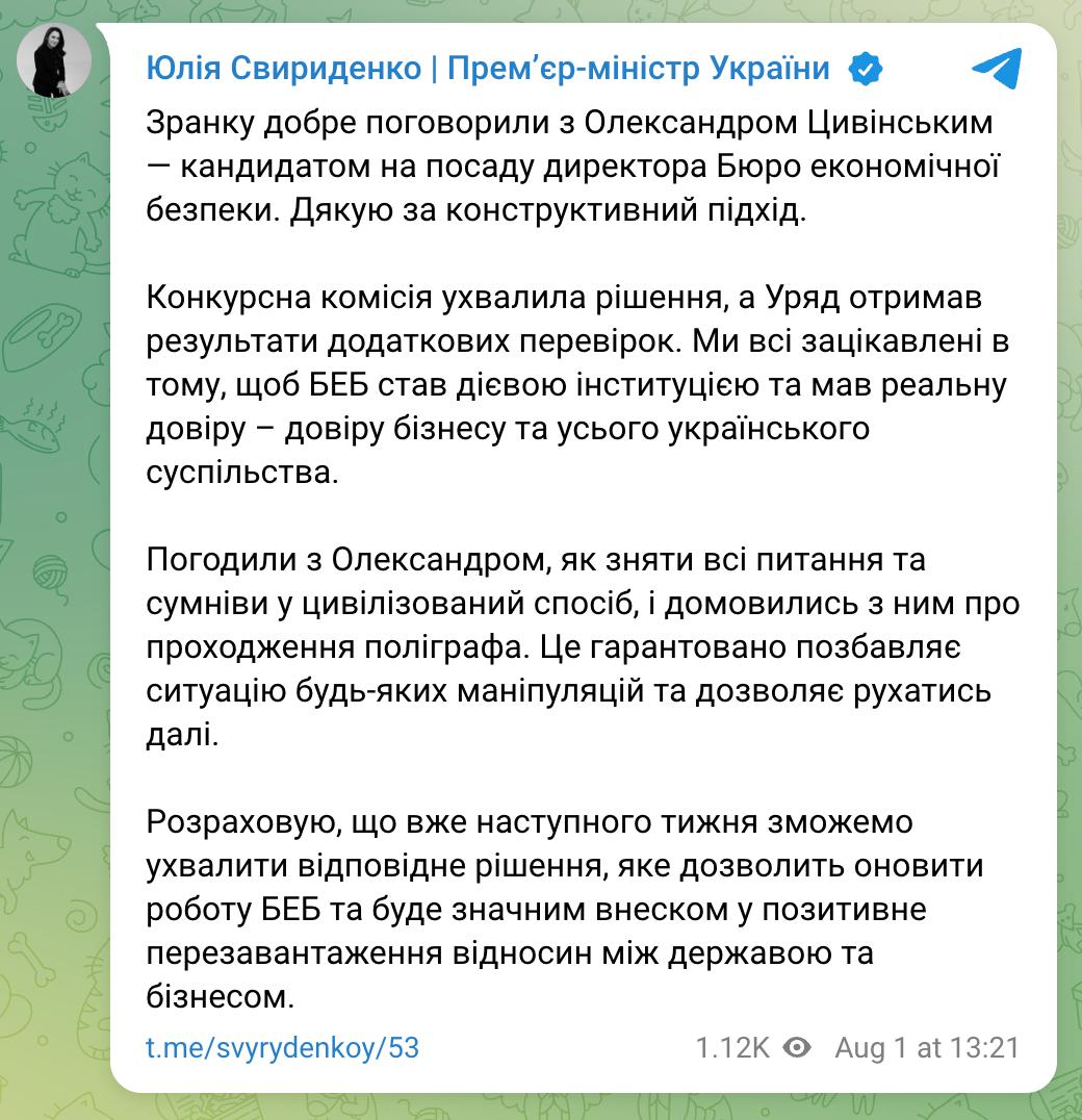 Кабінет міністрів наступного тижня може призначити Олександра Цивінського головою Бюро економічної безпеки. Про це повідомляє прем'єр-міністр Юлія Свириденко.