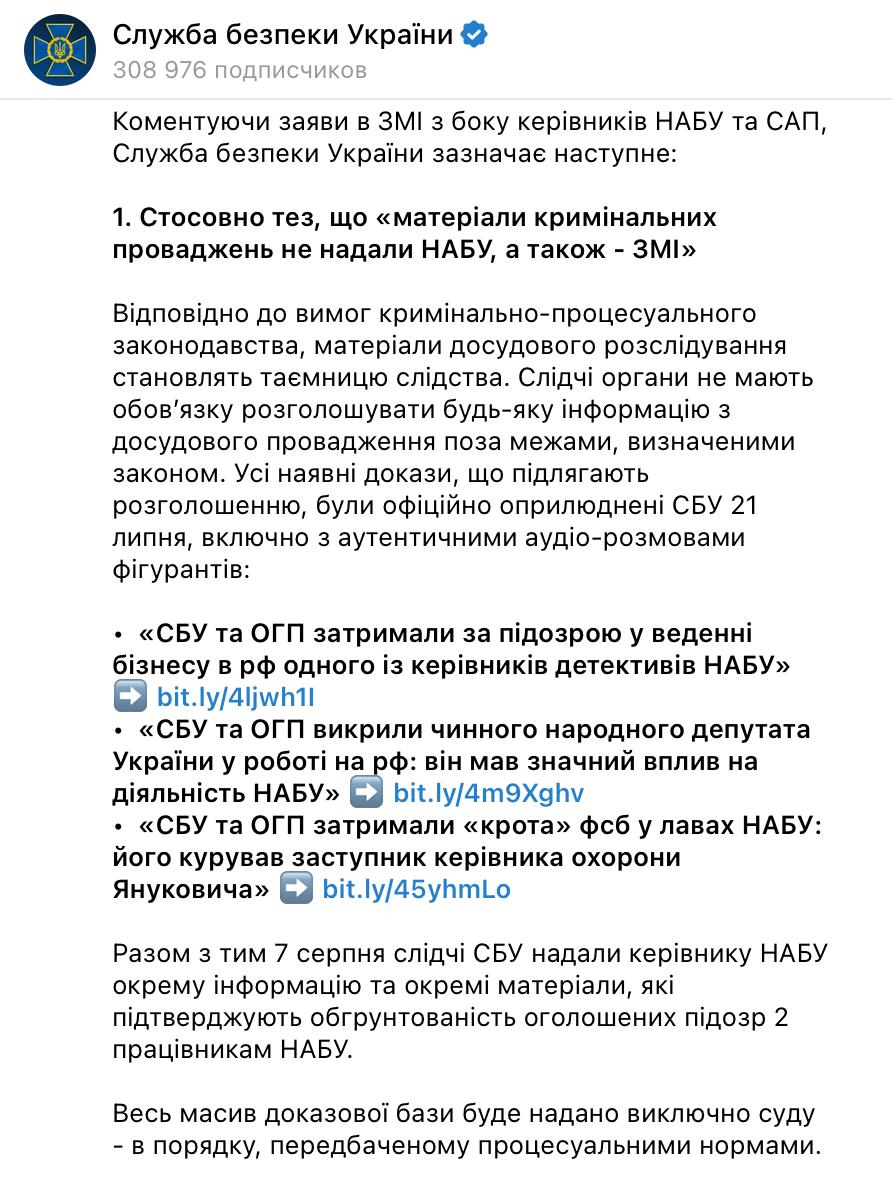 СБУ своєю чергою у різкій формі відмовила НАБУ у вимозі публічно розкрити всі матеріали справи щодо заарештованих детективів.
