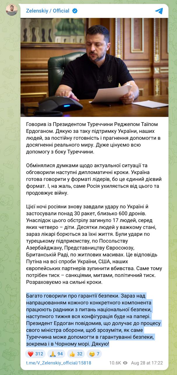 "Багато хто говорив про гарантії безпеки. Зараз над напрацюванням кожного конкретного компоненту працюють радники з національної безпеки, наступного тижня вся конфігурація буде на папері", - пише Зеленський після переговорів з президентом Туреччини Реджепом Тайіпом Ердоганом.