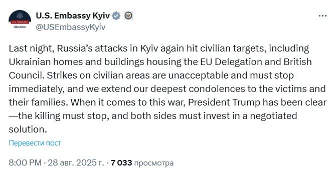 Посольство США в Україні після ударів по Києву нагадало про заклик американського президента Дональда Трампа до переговорів України та Росії.