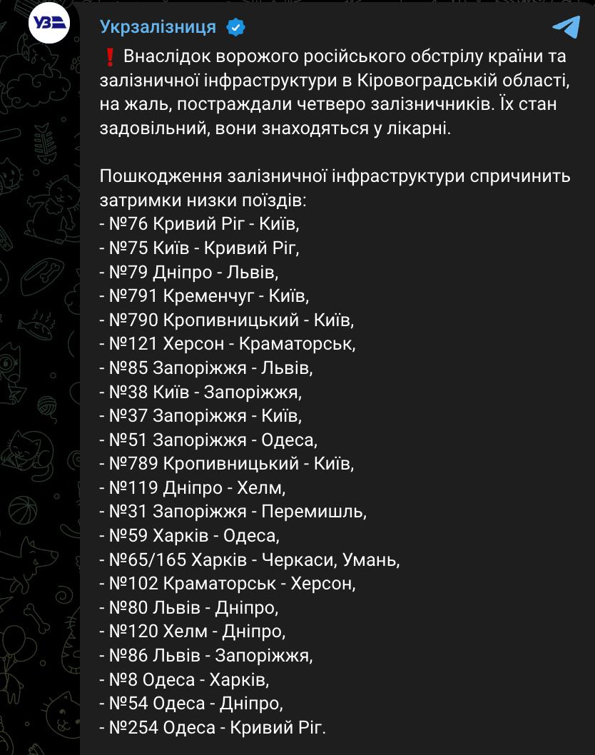 У Знам'янці на Кіровоградщині пошкоджено 17 будинків, частина громади залишилася без світла, є постраждалі. На Кіровоградщині також пошкоджено залізничну інфраструктуру, через що затримуються потяги.