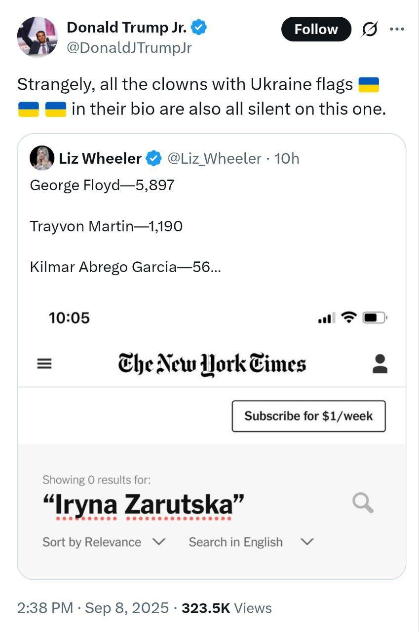 Син Трампа звинуватив у замовчуванні історії із вбивством українки темношкірим у США не лише ЗМІ, орієнтовані на Демпартію, а й проукраїнських користувачів.