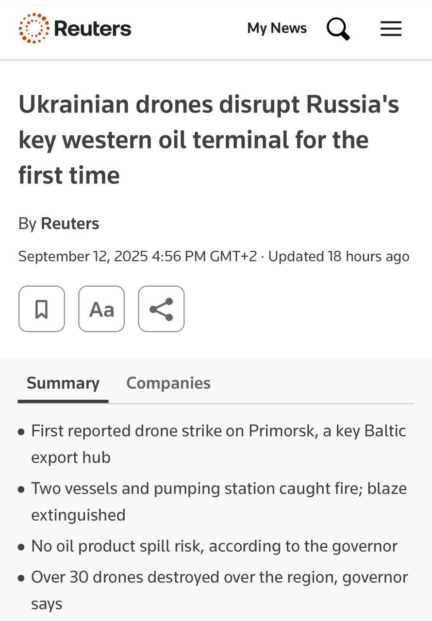 У ході недавньої атаки БпЛА на російський Приморськ було пошкоджено два нафтові танкери "тіньового флоту". Через це призупинено роботу нафтотерміналу.