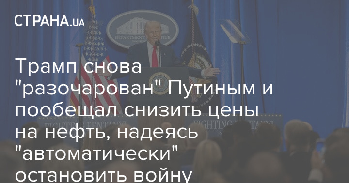 Президент США Дональд Трамп знову заявив про "розчарування" російським головником Володимиром Путіним і пообіцяв знижувати ціни на нафту. У такий спосіб він сподівається "автоматично" зупинити війну в Україні.