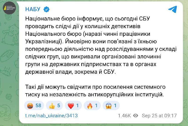 "Національне бюро інформує, що сьогодні СБУ проводить слідчі дії у колишніх детективів Національного бюро (нині діючі працівники "Укрзалізниці"). Ймовірно, вони пов'язані з їхньою попередньою діяльністю над розслідуваннями у складі слідчих груп, які викривають організовані злочинні групи на державних підприємствах і в органах. посилення системного тиску на незалежність антикорупційних інституцій", - вважають у НАБУ.