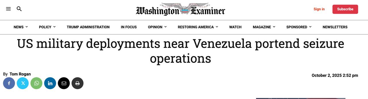 "Справді, як стало відомо виданню Washington Examiner, військові стратеги вважають, що зібраних сил тепер достатньо для захоплення і утримання на території Венесуели ключових стратегічних об'єктів, таких як порти та аеродроми (видання Washington Examiner не розголошує деякі подробиці з міркувань національної безпеки). Контроль США над такими об'єктами у Венесуелі з оборонних позицій", - йдеться у статті.