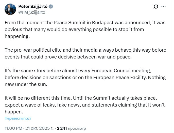 "З того моменту, як було оголошено про проведення саміту миру в Будапешті, було очевидно, що багато хто зробить усе можливе, щоб його не сталося. Провоєнна політична еліта і її ЗМІ завжди поводяться так перед подіями, які можуть виявитися вирішальними між війною і миром. фонді світу. Ніщо не нове під сонцем. Цього разу все буде по-іншому.