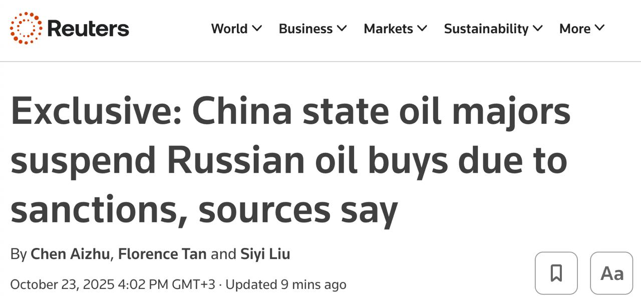 Тим часом, агентство Reuters з посиланням на джерела написало, що китайські державні нафтові компанії призупинили закупівлі російської нафти через нові американські санкції. Як сказано в матеріалі, очікується, що приватні заводи з переробки нафтопродуктів теж призупинять закупівлі, щоб оцінити вплив санкцій, але спробують їх обійти і відновити закупівлі.