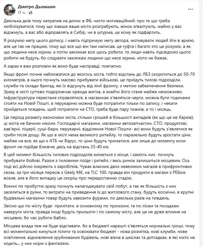 "Разом з тиловиками поїде і рітейл, і весь ринок залишиться місцевим. Ось тоді все дійсно охороняють із заробітків. Чувак, власник двох невеликих магазинів у прифронтових селах, за три місяці пересів з Geely MK, на TLC 100, правда він продукти в магазини з РЕБом. після прибуття відразу почнуть налагоджувати свій побут, а оскільки більшість із них заселяться в руїни, то витрати на приведення їх у житловий стан будуть космічні, у великі будівельні магазини товар завозитимуть фурами, по кілька разів на тиждень.