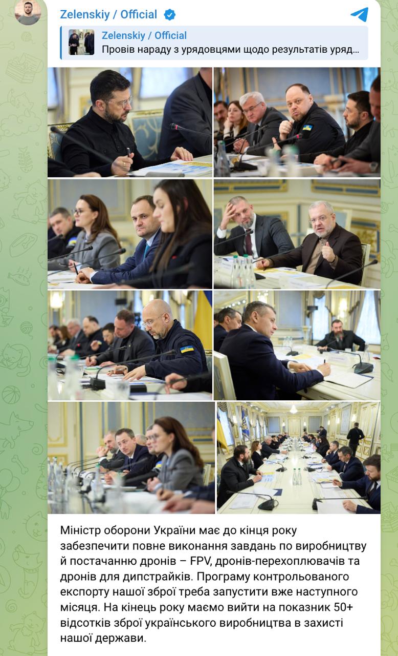 "Міністр оборони України має до кінця року забезпечити повне виконання завдань з виробництва та постачання дронів – FPV, дронів-перехоплювачів та дронів для дипстрайків. Програму контрольованого експорту нашої зброї потрібно запустити вже наступного місяця. До кінця року мають вийти на показник 50+ відсотків зброї українського виробництва у захисті.
