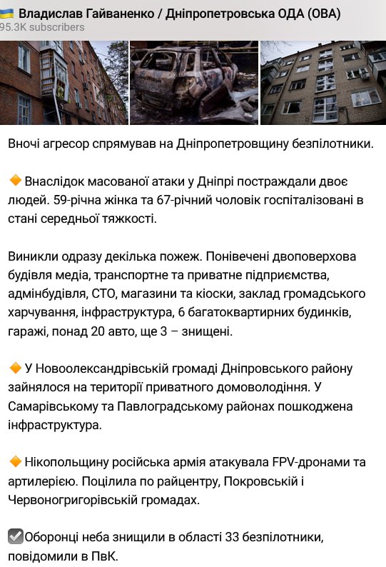 В ОВА уточнили, що вночі сили ППО збили 33 безпілотники над Дніпропетровською областю.