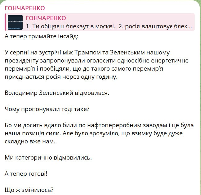 Тим часом народний депутат (партія "Євросолідарність") Олексій Гончаренко повідомив, що у серпні на зустрічі між Трампом та Зеленським останньому запропонували оголосити енергетичне перемир'я та пообіцяли, що до такого ж перемир'я приєднається Росія за одну годину, але Зеленський відмовився.