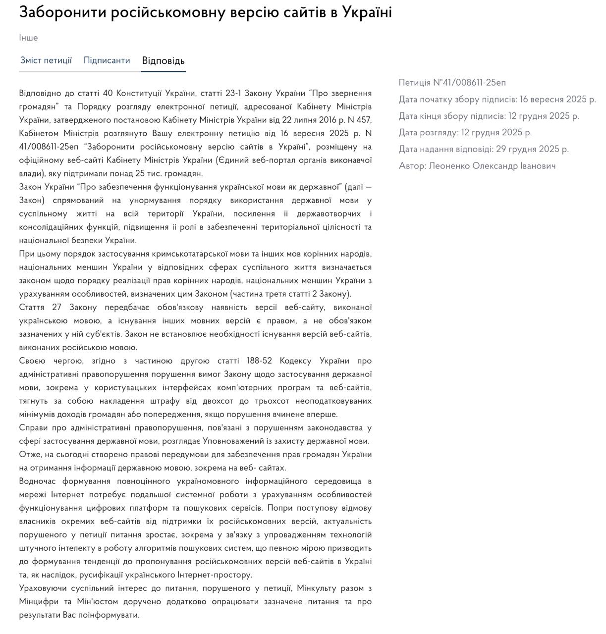 "Водночас формування повноцінного україномовного інформаційного середовища в мережі Інтернет потребує подальшої системної роботи з урахуванням особливостей функціонування цифрових платформ і пошукових сервісів. Незважаючи на поступову відмову власників окремих веб-сайтів від підтримки їх російськомовних версій, актуальність піднятого в петиції питання зростає, зокрема, в систем, що до певної міри призводить до формування тенденції до пропозиції російськомовних версій веб-сайтів в Україні і, як наслідок, русифікації українського інтернет-простору. З огляду на суспільний інтерес до питання, порушеного у петиції, Мінкультури спільно з Мінцифрою та Мін'юстом доручено додатково опрацювати зазначене питання та поінформувати вас про результати", - звернулася Свириденко до автора петиції.