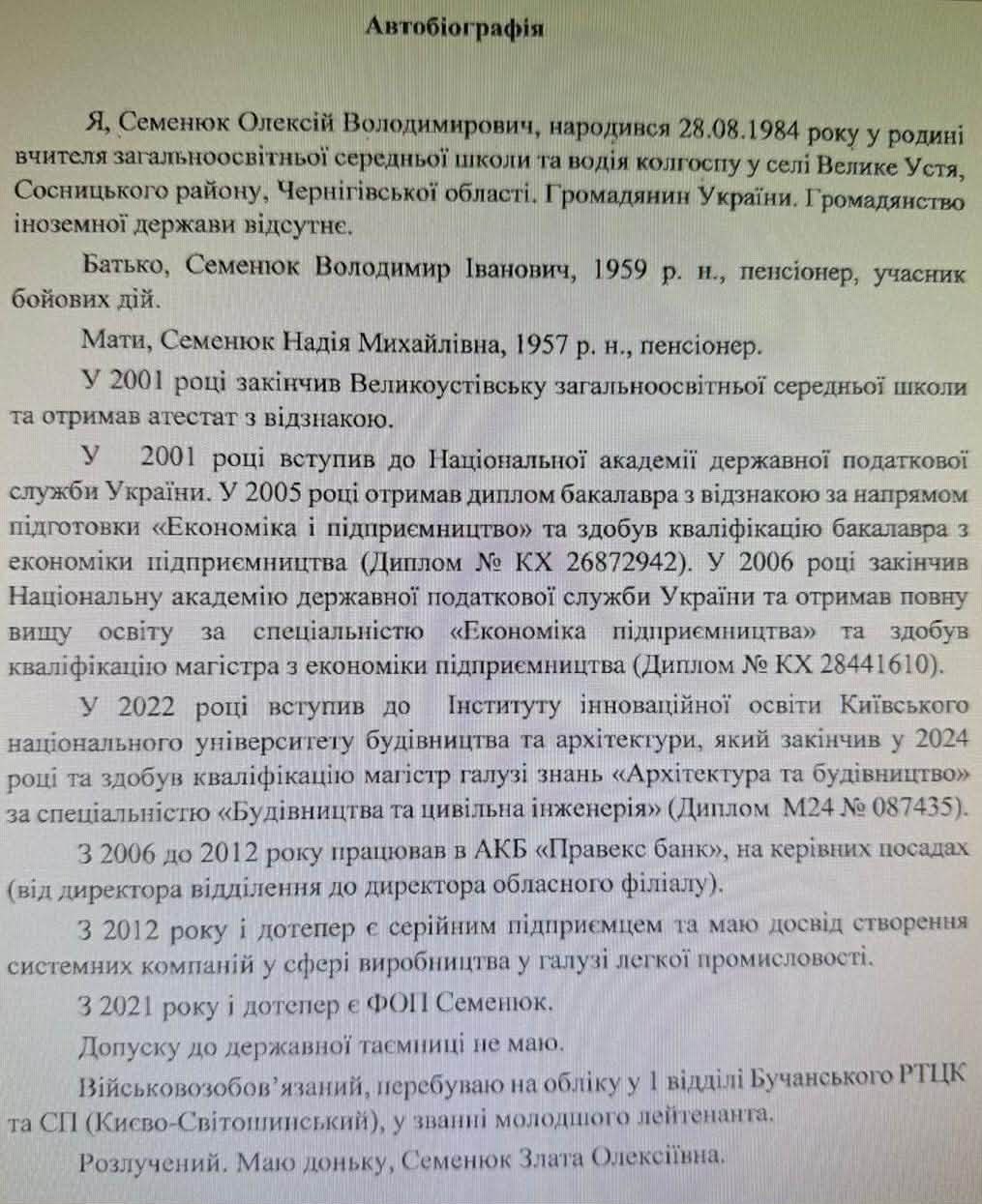 Олексій Семенюк народився 1984 року в Чернігівській області. За освітою економіст та магістр у сфері економіки підприємництва, пізніше здобув другу магістерську освіту в галузі будівництва та цивільної інженерії. Навчався з відзнакою.