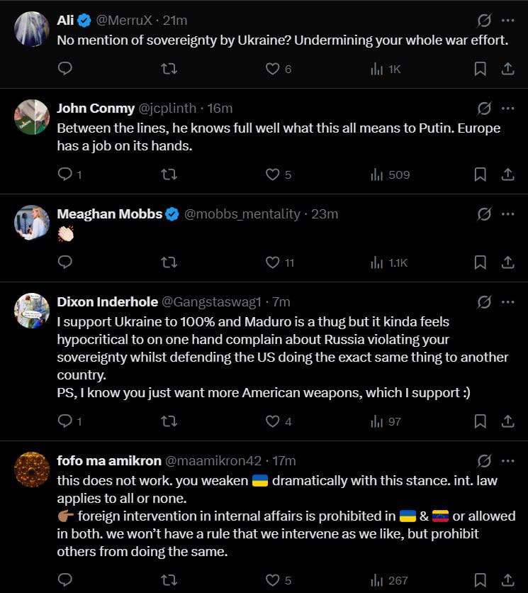 "Я на 100% підтримую Україну, і Мадуро - бандит, але мені здається лицемірним з одного боку скаржитися на те, що Росія порушує мій суверенітет, а з іншого - захищати США, які роблять те саме з іншою країною", - відповів Сібіге один з користувачів.