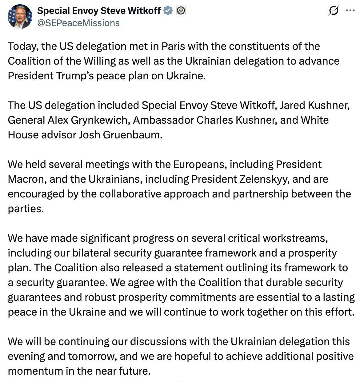 Публікуємо повну заяву Віткоффа за підсумками переговорів із "коаліцією бажаючих" у Парижі щодо гарантій безпеки України.