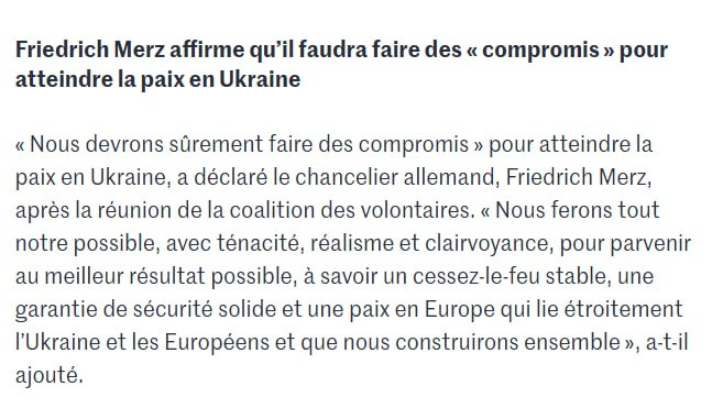 "Нам, безумовно, доведеться піти на компроміси, щоб досягти миру в Україні. Ми зробимо все можливе, з завзятістю, реалізмом і далекоглядністю, щоб досягти найкращого можливого результату: стабільного припинення вогню, надійних гарантій безпеки і миру в Європі, який тісно зв'яже Україну і євро" німецький канцлер газета Le Monde.